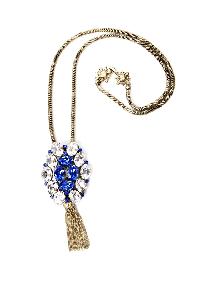 SV Couture Tassel Necklace in Clear crystal, Sapphire crystal, and Brass. Can be worn with or without tassel as the tassel is removable. 15"-17"